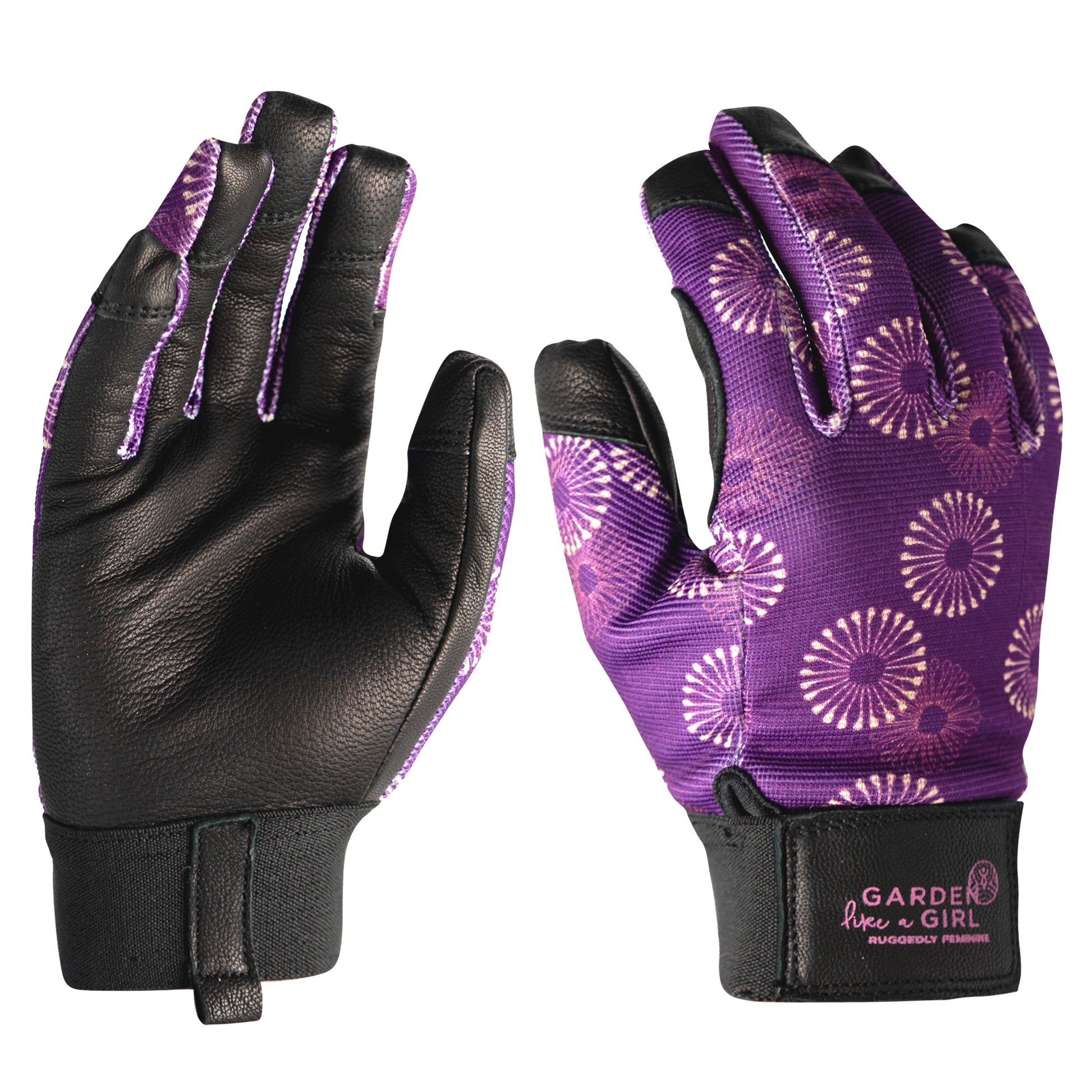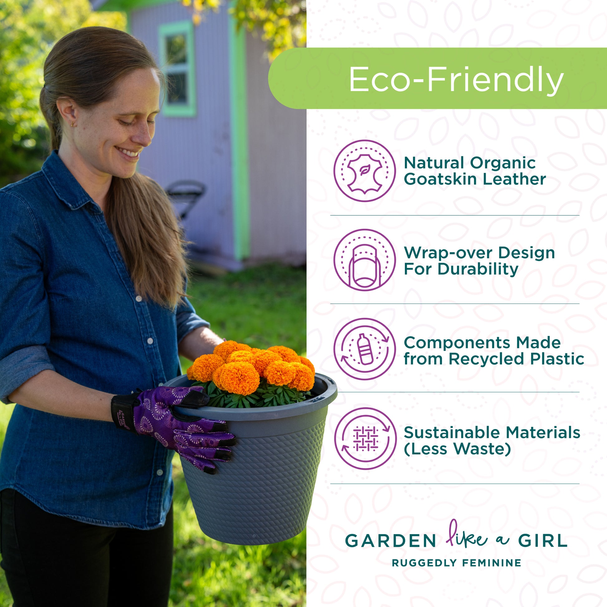 Durable, lightweight everyday garden gloves, made from sustainable leather/mesh materials, and designed to fit the Ruggedly Feminine gardener.